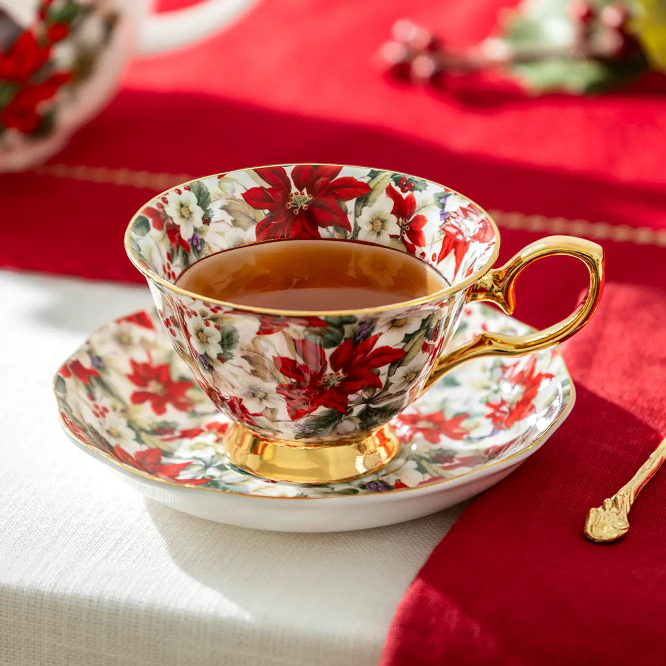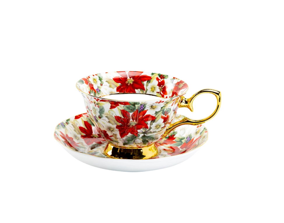 7 oz Poinsettia Chintz Gold Bone China Tea Cup and Saucer