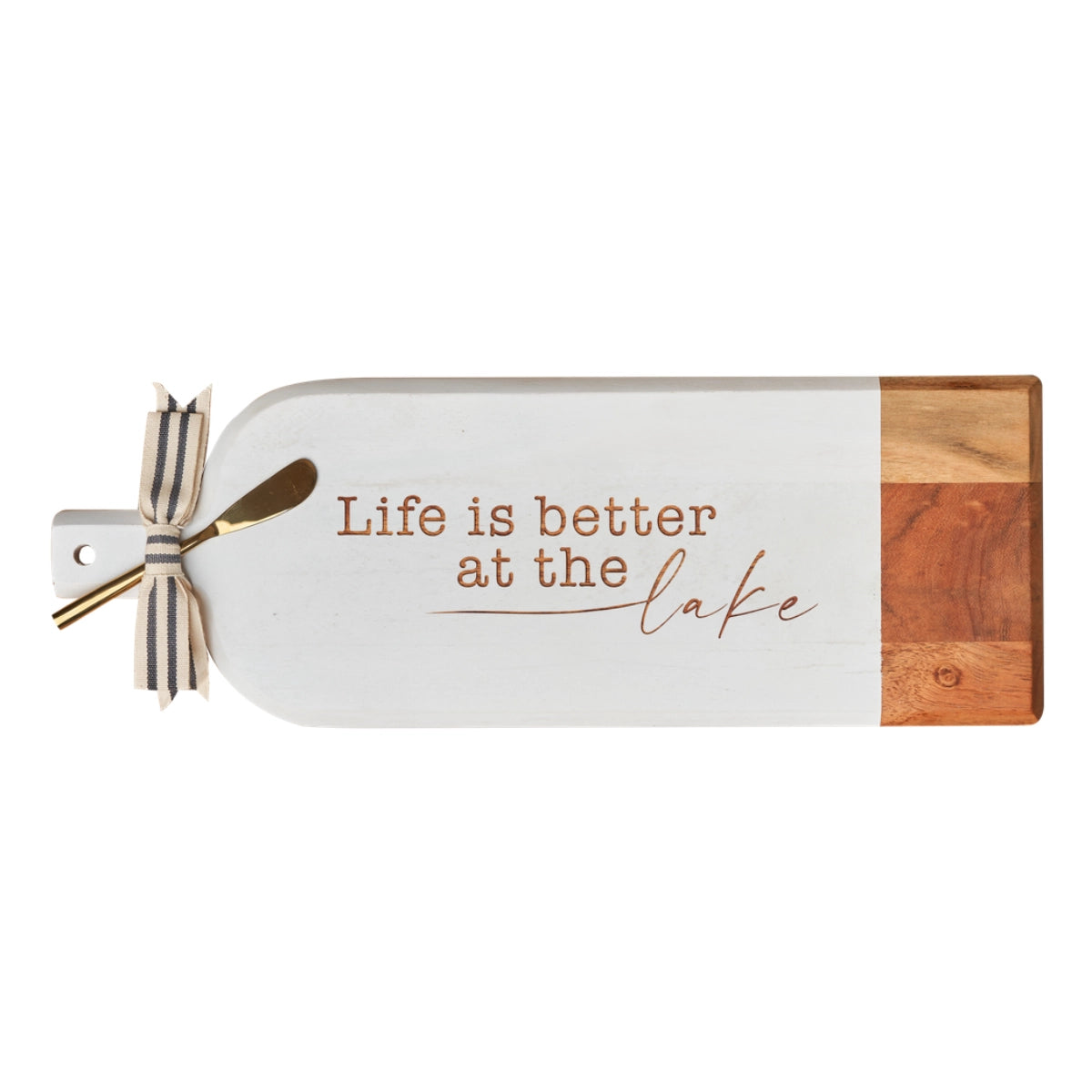 Acacia Bevel Board Long White w/ Gold Spreader & Ribbon | Life Is Better At A Lake | 20 X 7"